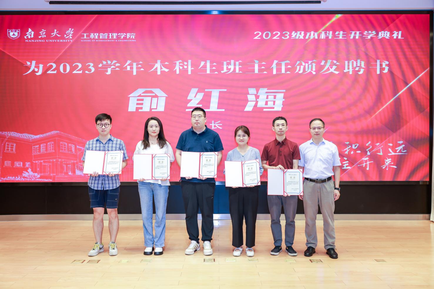 随后,俞红海为2023级本科生班主任陈虹桥(徐薇代领)、胡毅、金玉、黄伟桓、孙宇祥颁发聘书。