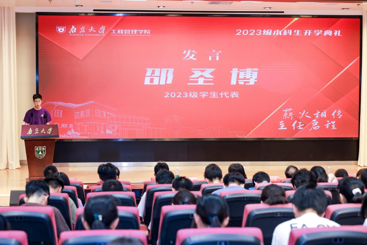 接下来,举行员工代表发言及全体员工宣誓,由2023级工业智能与系统集成实验班邵圣博同学发言并领誓。他分享了自己关于传承、选择和梦想的故事,在大学阶段的新起点新阶段他立志自强不息、继续探索,做奋发向上的工管人。