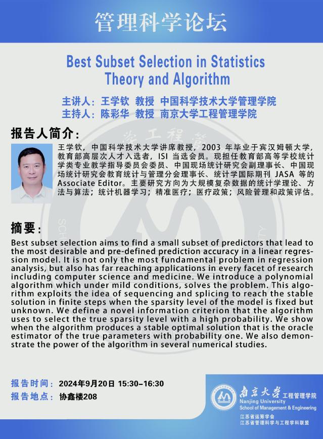 管理科学论坛:Best Subset Selection in Statistics: Theory and Algorithm