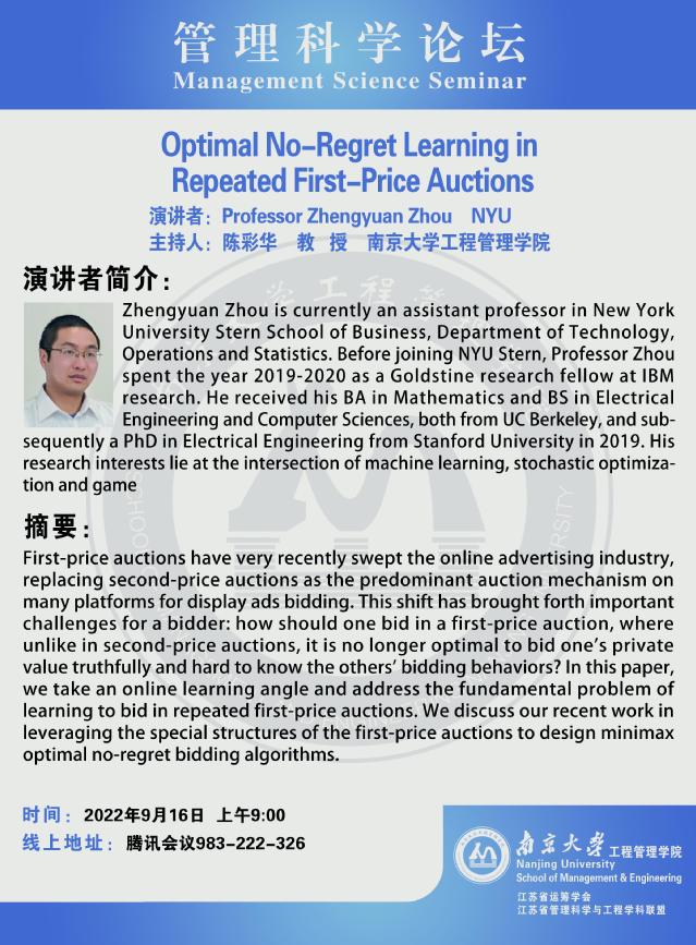 管理科学论坛:Optimal No-Regret Learning in Repeated First-Price Auctions