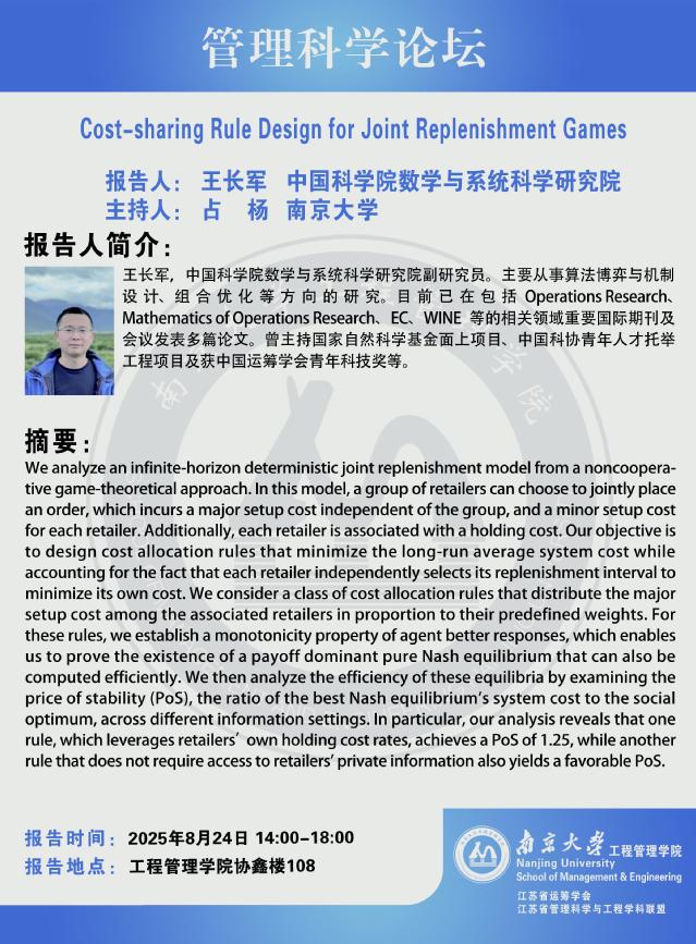 管理科学论坛:Cost-sharing Rule Design for Joint Replenishment Games