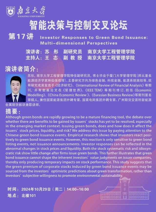 智能决策与控制交叉论坛:Investor Responses to Green Bond Issuance: Multi-dimensional Perspectives