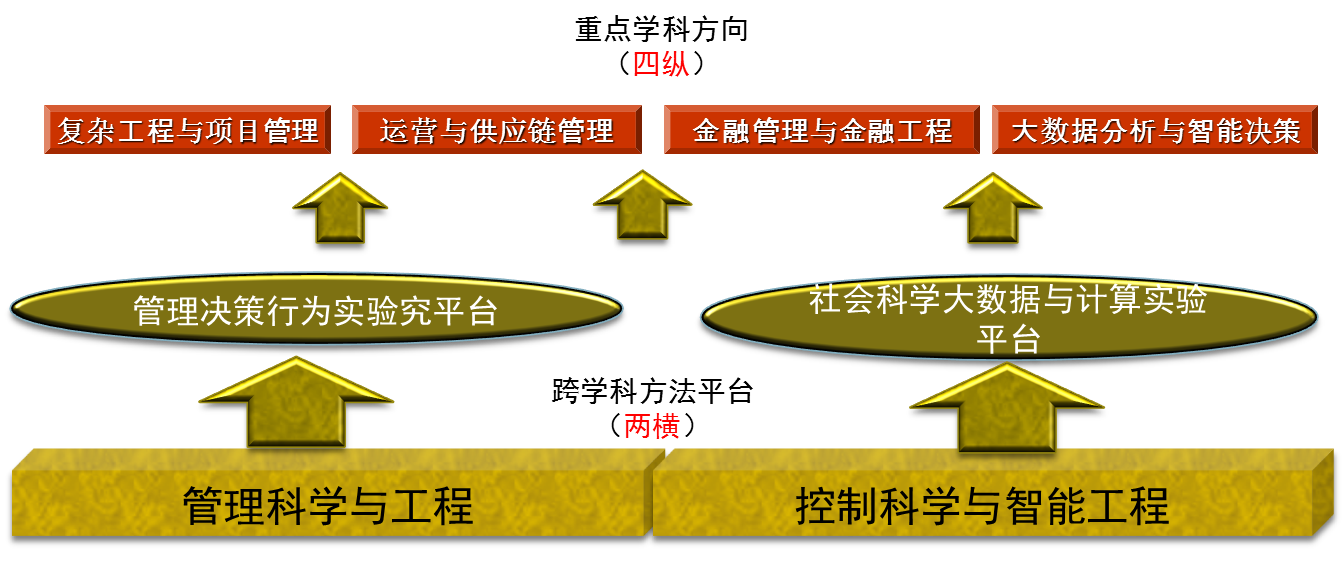 公司以“特色、交叉、高水平、国际化”为团队建设的宗旨,并结合公司自身特点,坚持“管理-控制一体化”的交叉融合发展理念,以理论研究瞄准国际学术前沿、应用研究瞄准国家重大需求为学科发展目标,以管理科学与工程和控制科学与智能工程两大学科为基础,以已有雄厚科研基础的“智能决策行为实验平台”和“社会科学大数据与计算实验平台”为支撑(两横),凝炼形成了具有鲜明特色的四个研究方向(四纵),科学规划了“两横四纵”的学科布局: